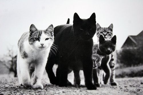 «Esta foto se llama The Mob. (La Mafia ) Fue tomada en 1961 en Nueva Jersey por Walter Chandoha. Era un fotógrafo profesional de gatos, grabando más de 90.000 fotos de gatos. Su trabajo apareció en revistas como National Geographic y Life, así como en calendarios, libros y latas de comida para gatos. «
