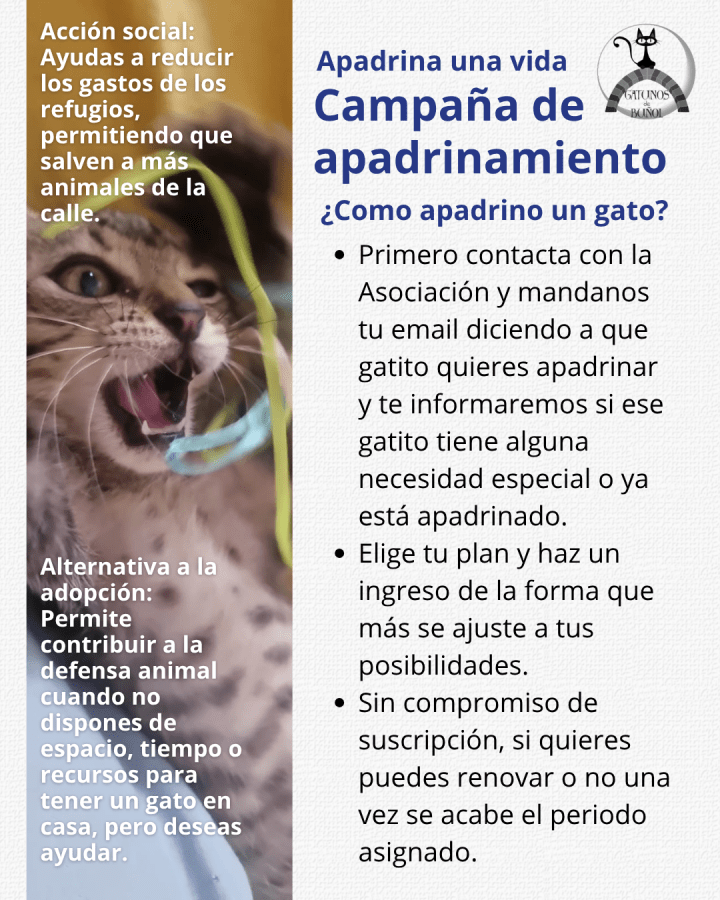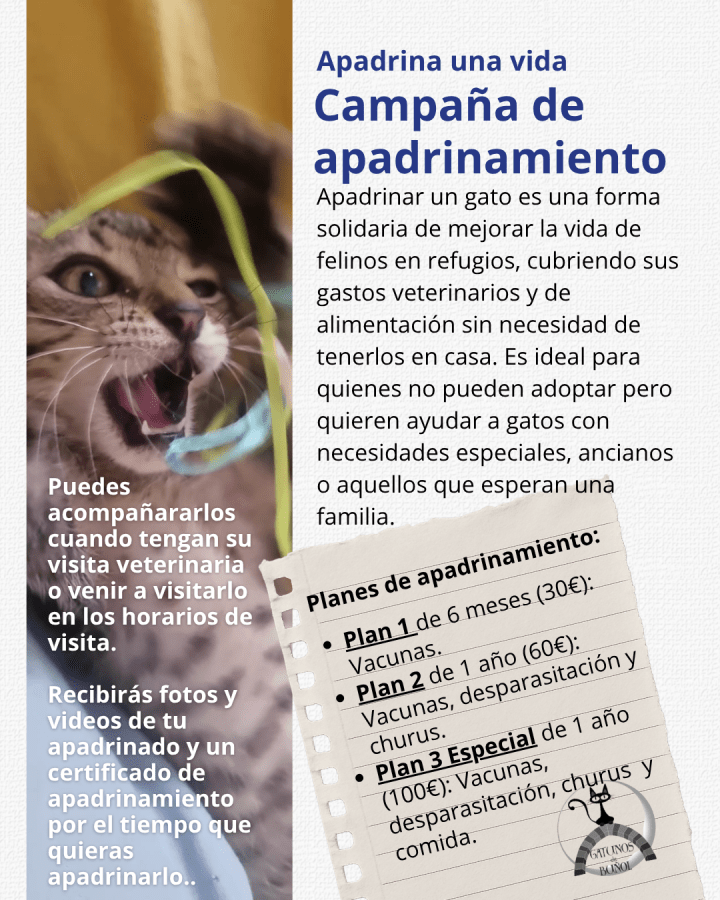 Buscando un humano favorito. ¿Te apuntas? Un pequeño gesto para ti, una vida entera para él. ¿No puedes adoptar? Apadrina y ayúdanos a cuidar de ellos. Muchos de estos gatitos llevan mucho tiempo en el Refugio, algunos son mayores que ya no tienen la oportunidad de salir adoptados, necesitan cuidados, comida, vacunas. Necesitan a una persona que ponga un poco de atención en ellos para que su vida sea más fácil. Sin compromiso ni suscripción, tan solo eliges la cantidad para 6 meses o 1 año y con ello cubrir sus necesidades. También puedes venir a visitarlo o acompañarlo al veterinario cuando lo tenga cita, saber su historia.